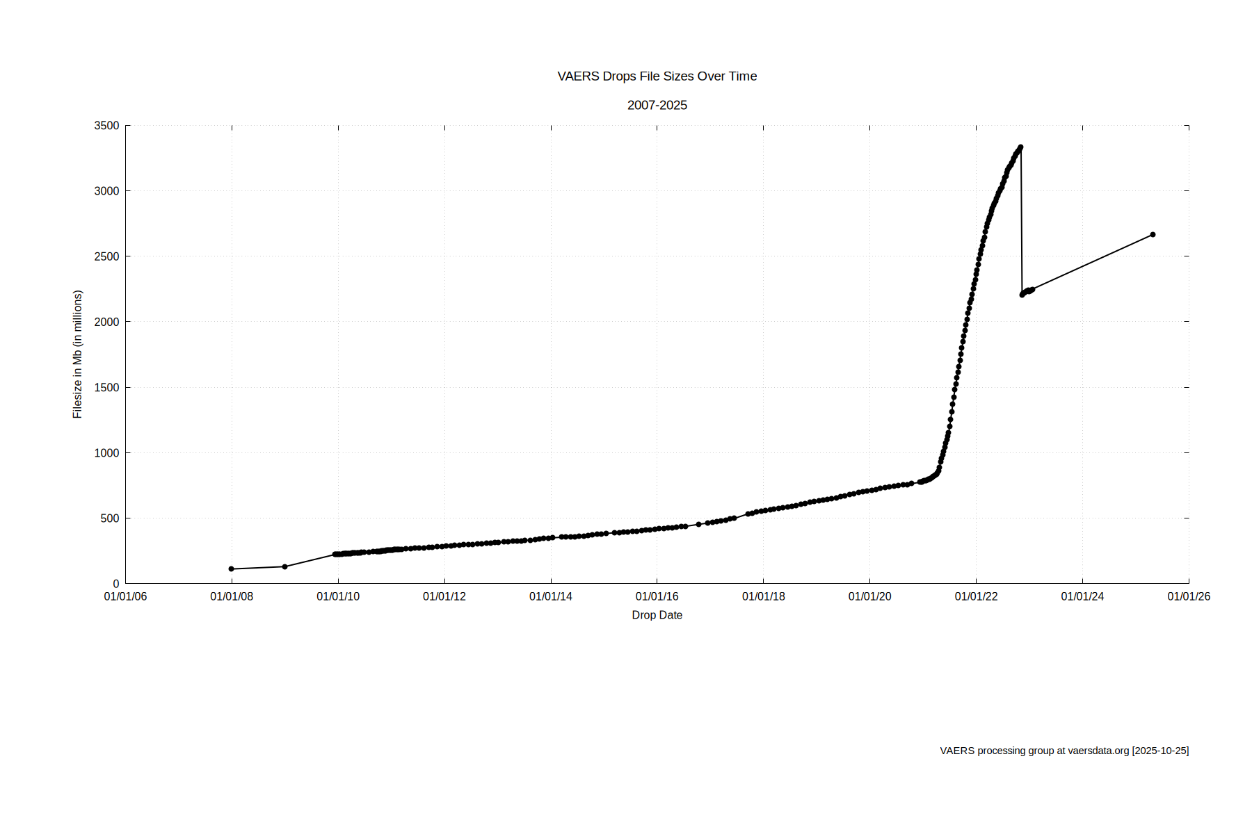 The chart titled "VAERS Drops File Sizes Over Time" elegantly illustrates the evolution of VAERS (Vaccine Adverse Event Reporting System) data drops, measured in millions of bytes, spanning from 2007 to April of 2025. Initially, the data size remained relatively stable, oscillating between 400 and 700 million bytes from 2016 through early 2021. A marked exponential surge commenced in mid-2021, aligning with the widespread rollout of COVID-19 vaccinations, culminating in a peak exceeding 3,500 million bytes around October 2021. Subsequently, a precipitous decline occurred in November 2022, followed by a gradual stabilization at approximately 2,200 to 2,500 million bytes through early 2025 [1].